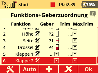 Für die Grundeinstellung der Klappen benütze ich jeweils einen Dreifachschalter. Wenn die Servoeinnstellungen gemacht sind, lösche ich den Geber wieder.
