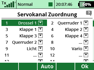 Dann wird das automatisch verknüpft und dann müssen nur die Ausschläge angepasst werden und Flugphasen eingerichtet. Und Butterfly...