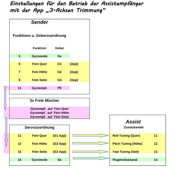 Die App erzeugt 3 Geberfunktionen (G1-G3). Diese werden im Sender unter Funktion+Geberzuordnung den 3 Fein-Kanälen anstatt normaler Geber zugeordnet. Die Einstellung der 3 Achsen erfolgt dann über die Schalter der App. Grosser Vorteil ist, dass nach der Einstellung die App ausgeschaltet wird und die Daten nun gespeichert sind. Es braucht kein Nachbearbeiten mit Kurvenfunktion und dergleichen.